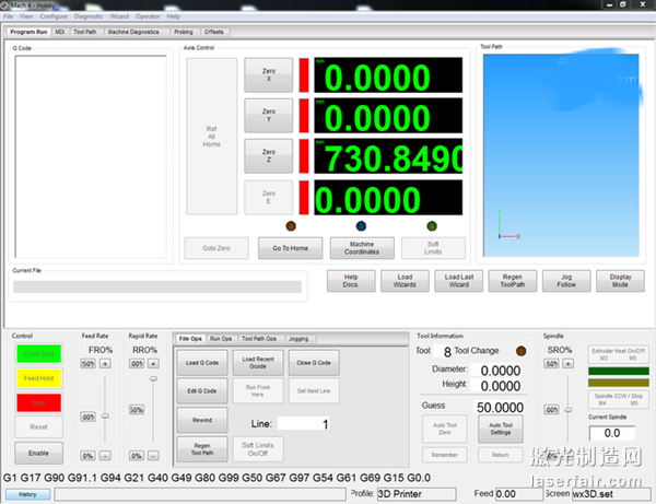 在開發(fā)CollideOScope的線材多路復(fù)用腳本的同時,該團隊也一直致力于軟件的開發(fā)。他們還與Newfangled Solutions建立起了合作關(guān)系,后者曾經(jīng)開發(fā)出了Mach4的一個版本(如下圖),這是一款CNC的運動控制器器接口軟件。該AAM-T版本的MACH4能夠把任何銑床變成3D打印機,而且具有復(fù)用電機驅(qū)動器的能力。此功能可以用單臺電機驅(qū)動器來驅(qū)動多個不同的電機,而這正是CollideOscope所需要的。