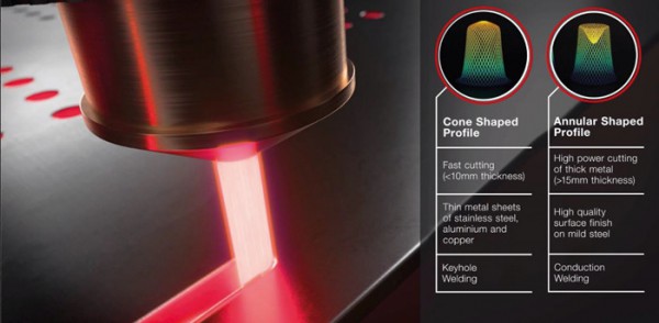1) A Low Beam Parameter Product (BPP) mode profile, excellent for fast cutting of thin metals, especially bright highly reflective ones, but also for producing high speed high quality pierces in thick sheets. 2) A High BPP mode giving excellent, smooth cut edges at good speeds when cutting thick metal sheets, especially mild steel.
