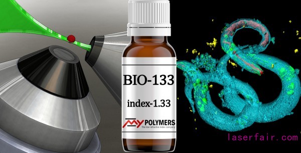 BIO-133 from MY Polymers Ltd. enables breakthrough in fluorescence microscopy. The refractive index of this UV cured polymer is 1.33 – the same as water, cells and tissues. Therefore, it eliminates imaging distortion. In addition, the material was designed to minimize cytotoxicity and fluorescence.