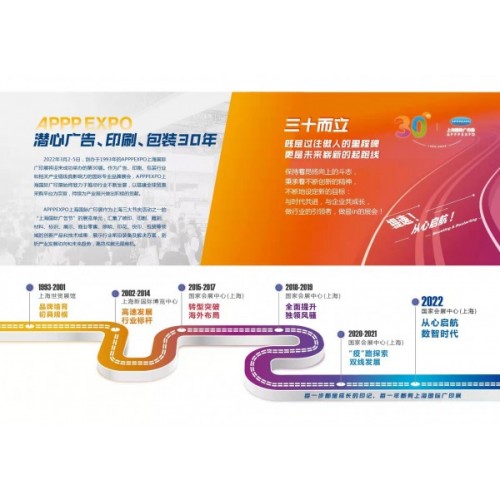 作為廣告標識行業(yè)和相關(guān)產(chǎn)業(yè)鏈極具影響力的國際專業(yè)品牌展會,APPPEXPO上海國際廣印展始終致力于推動行業(yè)不斷發(fā)展,以搭建全球貿(mào)易采購平臺為宗旨,持續(xù)為產(chǎn)業(yè)振興做出積極的貢獻。2022年3月2-5日,國家會展中心(上海)APPPEXPO上海國際廣印展將迎來她的30周年慶典。