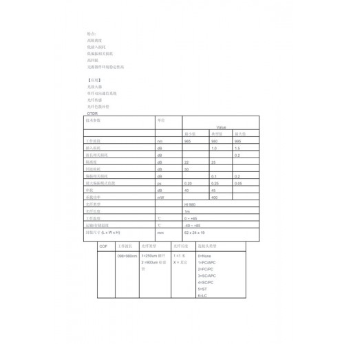 波長可調激光器:波長可調光源(步長50G) 模塊或臺式 ;C-band 或 L-band ITU波長可選( C波段可調諧激光光源,89個波長,0.4nm間隔5~20mW功率調節(jié),L波段可調諧激光光源,127個波長,0.4nm間隔5~10mW功率調節(jié) ,L波段可調諧激光光源,193個波長,0.4nm間隔8mW功率固定)。