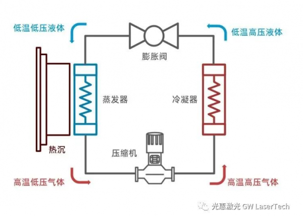 壓縮機(jī)制冷散熱原理:壓縮機(jī)壓縮冷媒,使冷媒變成高溫高壓的氣體,并流向外部冷凝器。高溫高壓氣體冷凝成低溫高壓的液體,液化產(chǎn)生的熱量隨風(fēng)扇排出機(jī)器外。低溫高壓的液體冷媒通過膨脹閥降壓后變成低溫低壓易蒸發(fā)的狀態(tài),并流向內(nèi)部蒸發(fā)器。蒸發(fā)器吸收熱量,使激光器內(nèi)部溫度降低,達(dá)到降溫的效果,然后冷媒汽化成高溫低壓的氣體。經(jīng)蒸發(fā)器蒸發(fā)后的氣體冷媒再次被壓縮機(jī)壓縮,往復(fù)循環(huán),便實現(xiàn)了機(jī)器內(nèi)部的散熱。