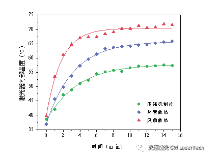 在實驗室中,我們采用恒溫恒濕的試驗箱設(shè)定35℃來模擬夏季的高溫使用環(huán)境,在開滿1500W功率的情況下,測試采用不同風(fēng)冷方案的激光器內(nèi)部增益光纖溫度隨時間的變化。從實驗數(shù)據(jù),可以明顯看出:光纖溫度在開始的幾分鐘內(nèi)呈現(xiàn)指數(shù)增長,在10分鐘左右趨于穩(wěn)定。由于壓縮機(jī)的制冷作用,可以對激光器進(jìn)行主動降溫,故溫度可以控制在60℃以下,溫度變化相對平穩(wěn);而另外兩種只能依靠被動散熱,故內(nèi)部溫度要略高于壓縮機(jī)制冷方案;其中,由于熱管的傳熱效率高,能很好地將熱量從激光器內(nèi)部導(dǎo)出,因此它內(nèi)部的溫度要比純風(fēng)扇的低一點,溫度上升也更趨于平緩。