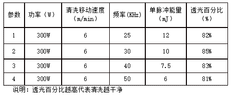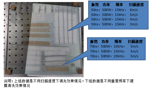 四、玻璃鍍膜清洗應(yīng)用案例 RFL-P300H RFL-P300H激光器是圓形光斑多模激光器,最大單脈沖能量為15mJ,聚焦后的光斑直徑大約在0.36mm,光束質(zhì)量因子M2為10。 激光鍍膜玻璃照射光斑圖 激光鍍膜層清洗顯微鏡圖 玻璃單銀除膜參數(shù)為:130ns,300W,30kHz,線寬15mm,清洗速度6m/min,能清除干凈鍍膜表面,表面呈透明色,同時橫向與縱向光斑也能搭接起來。 測試的幾組工藝參數(shù)如下表所示: RFL-P500H RFL-P500H激光器是圓形光斑多模激光器,最大單脈沖能量為50mJ,聚焦后的光斑直徑大約在1mm,光束質(zhì)量因子M2為62.5。 激光鍍膜玻璃照射光斑圖 激光鍍膜層清洗顯微鏡圖 玻璃單銀除膜參數(shù)為:100ns,500W,15kHz,線寬15mm,清洗速度8m/min,能清除干凈鍍膜表面,表面呈透明色,同時橫向與縱向光斑也能搭接起來。 測試的幾組工藝參數(shù)如下圖所示: 從以上數(shù)據(jù)可看到重復(fù)頻率15kHz,掃描速度5m/s下清洗更徹底,白色更明顯。