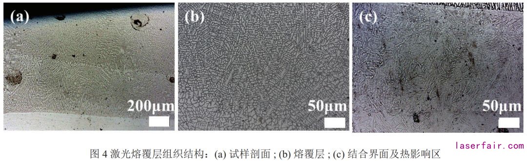 圖 4 為熔覆層的組織結構,由圖 4(a)、(b) 可見,熔覆層無裂紋、氣孔等缺陷,組織呈細小致密的枝晶狀。且結合界面清晰平滑,可見白亮窄帶,說明熔覆層與基體之間為冶金結合。在大激光功率下,基體和熔覆材料吸收的有效能量密度大,熔池停留時間短,驟熱驟冷,故激光熔覆層的組織較為細小、均勻,主要組織均為馬氏體和少量殘余奧氏體。如圖 (c) 所示,結合界面附近的基體組織的細晶區(qū),該區(qū)域冷卻后形成較為粗大的回火馬氏體。