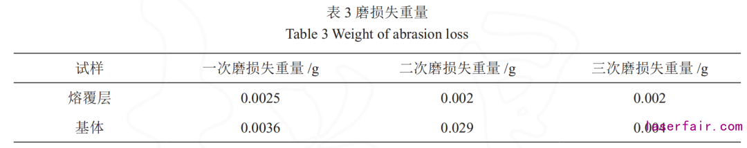 分別取基體和熔覆層試樣,經(jīng)清洗、干燥后分別稱取重量作為原始重量,使用 MMU-10G微機控制機高溫摩擦磨損試驗機檢測耐磨性。與45鋼進行對磨操作,對磨時間控制為1.5h,再次清洗、干燥后使用萬分之一電子天平稱取重量,作為磨損后重量,計算磨損失重量,重復進行三次,得出的實驗數(shù)據(jù)如表3。在三次對磨過程中,熔覆層試樣的磨損失重量均明顯低于基體試樣的磨損失重量,說明采用本技術方法進行熔覆的缸體內(nèi)壁,其耐磨性能優(yōu)于立柱基體的耐磨性能,約為基體的 1.5 倍。