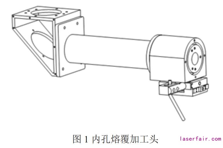 通過對設計的單元模塊進集成和調(diào)試,如圖1所示為完整的內(nèi)孔熔覆加工頭系統(tǒng),該系統(tǒng)具 備以下幾個特點:1)導光筒長度可調(diào)。本設計將導光筒模塊化,可適當增加或刪減中間筒的節(jié)數(shù),能夠滿足不同長度內(nèi)孔零部件進行熔覆時的技術需求;2)特置送粉嘴滑道裝置。在送粉嘴安裝處設計了滑道,能夠?qū)崿F(xiàn)送粉嘴的全方位調(diào)整,方便、 快捷,便于操作;3)熔覆頭部位設置保護氣功能。由于內(nèi)孔熔覆表面所處空間的限制,即使肉眼可見的缺陷也不容易檢測,更不容易修補,所以從工藝源頭上控制缺陷產(chǎn)生是關鍵。第一,需在熔覆頭部位設計了保護氣裝置,可以有效保護積分鏡,避免熔覆過程中飛起的煙塵與粉末對積分鏡污染;4)導光筒經(jīng)黑色陽極氧化處理;導光 筒采用黑色陽極氧化處理,能夠有效防止反光導 致的導光筒過熱現(xiàn)象。