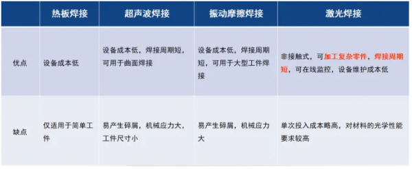 這四種焊接方式的優(yōu)缺點如下圖,其中塑料激光焊接的優(yōu)點尤為明顯,它可以加工復雜零件,且具有焊接周期短、可在線監(jiān)控、設備維護成本低的特點。