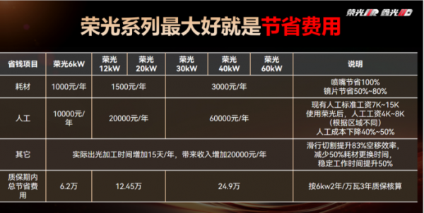 除了“切的穩(wěn)”是當(dāng)下終端關(guān)注的重點(diǎn),“切得省”同樣和其生產(chǎn)運(yùn)營(yíng)息息相關(guān)。榮光系列在人工成本上的節(jié)省尤為突出。時(shí)下超高功率激光切割的操作員薪酬平均1.5萬(wàn)/月。榮光配備一鍵切割,即使是小白也能輕松駕馭,這樣每月至少就能節(jié)省約5000的人工成本,一年下來(lái)就是6萬(wàn)元。此外,通過(guò)減少耗材的使用,每年還能額外節(jié)省3000元。更值得一提的是,榮光系列在創(chuàng)鑫“金保姆”政策之上,特別為用戶提供萬(wàn)瓦以下兩年質(zhì)保、萬(wàn)瓦以上三年質(zhì)保,進(jìn)一步保障用戶持久經(jīng)濟(jì)收益。