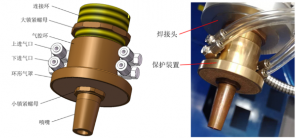 氣體保護(hù)是影響焊接質(zhì)量的一個重要因素,良好的氣體保護(hù)不僅可以減少焊接飛濺,還可提高焊縫光潔度。常規(guī)同軸吹氣保護(hù)方式如圖4.1所示,焊接頭最下端安裝有一個單層或雙層銅噴嘴,上方設(shè)置有橫吹模塊進(jìn)行飛濺防護(hù),噴嘴通過外接保護(hù)氣向焊接熔池施加保護(hù),該方式不足之處在于保護(hù)氣易卷入空氣,無法起到很好的氣體保護(hù)效果。