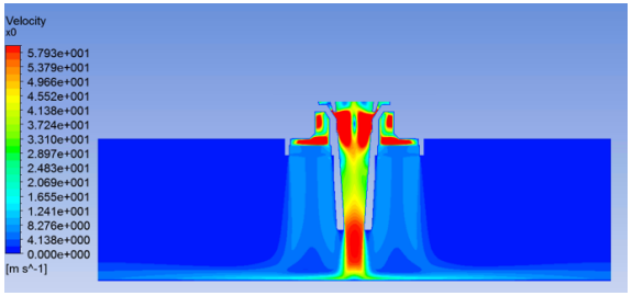 采用ansys軟件對裝置進(jìn)行氣流分析,輸入較優(yōu)參數(shù)進(jìn)行計(jì)算,得到如圖4.4所示的氣流速度云圖,氣罩氣流圓周對稱,噴嘴氣流速度較高,氣罩氣流速度較低,通過內(nèi)外高低流速的配合應(yīng)用,可兼顧焊接蒸氣羽煙的抑制與擴(kuò)散調(diào)節(jié),避免工件板面黑色煙塵附著。