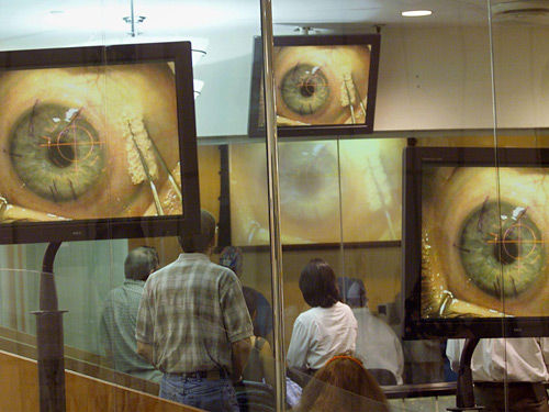 激光外科手術(shù)。激光在醫(yī)學(xué)上的首次成功應(yīng)用是進(jìn)行眼內(nèi)手術(shù),但是不需要切開眼球。早在1962年,一臺紅寶石激光器將病人脫落的視網(wǎng)膜與眼球重新連接,使他恢復(fù)了視力。更大的成功在1968年到來,外科醫(yī)生弗朗西斯·萊斯佩朗斯和貝爾實驗室的工程師使用氬離子激光器破壞異常的血管,以避免這些血管在視網(wǎng)膜中擴(kuò)散,致使糖尿病人失明。這種治療方法已經(jīng)挽救了數(shù)百萬人的視力。如今,激光也被用來切割角膜,以矯正視力,或者使胎記和刺青褪色。
