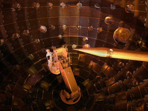 激光之母。受控核聚變很久以來都是人們認(rèn)為最理想的清潔能源發(fā)電方式。1962年,勞倫斯利弗莫爾國家實驗室的物理學(xué)家約翰·納科爾斯(John Nuckolls)在加利福尼亞州利弗莫爾,提出用激光脈沖加熱和壓縮的重氫同位素塊實現(xiàn)受控核聚變。從那以來,利弗莫爾實驗室一直追尋著這個理念,他們使用的激光器也越來越大,終于在美國國家點火實驗設(shè)施中達(dá)到巔峰。 這是一個復(fù)雜的系統(tǒng),可以同時發(fā)出192束激光,去年,在十億分之幾秒的時間內(nèi),產(chǎn)生了能量達(dá)到100萬焦耳的激光脈沖,使之成為有史以來能量最強(qiáng)的激光器。美國國家點火實驗設(shè)施 (NIF)是美國出于研究核聚變反應(yīng)設(shè)想而建造的試驗裝置。)