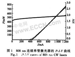 本試驗分別在40、80℃下對20只隨機抽取的波長808 nm的無Al連續(xù)輸出功率為1 W的單管激光器進行1.2 A恒流老化。老化前抽出10只在室溫下進行P-I-Y測試,如圖1所示。