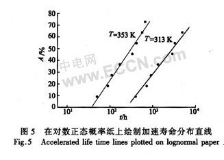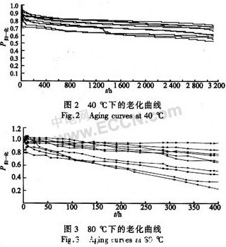 將數(shù)據(jù)代入式(2)、(3)可以解出Ea=0.52 eV/#p#分頁標(biāo)題#e#K,τ=25.2(相對于80℃)。進而,可以計算出中值壽命tm=330×25.2=8 320 h。