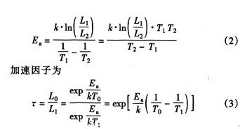 式中,L為壽命,#p#分頁標(biāo)題#e#Ea為激活能,A為常數(shù),k(8.62×10-5eV/K)為波爾茲曼常數(shù),T為熱力學(xué)溫度。確定了失效模式的激活能以后,就可以得出加速系數(shù)τ。設(shè)室溫T0下壽命為L0,加速試驗中溫度T1下壽命為L1,溫度T2下的壽命為L2(T2>T1),則激活能的計算式為