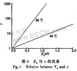 不同溫度下Ea與τ的關(guān)系如圖4所示,不同溫度下,溫度越高,曲線斜率越大,加速效果越明顯;相同溫度下,激活能越大,加速系數(shù)越大。由于失效機理不同,激活能也不一樣。