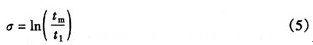 中值壽命對應(yīng)于圖5中#p#分頁標(biāo)題#e#50%器件失效的時間,標(biāo)準(zhǔn)差σ表示壽命分布的寬度,也容易從圖中經(jīng)過簡單計算得到,它決定于對數(shù)正態(tài)概率紙上累積失效率曲線的斜率,其計算公式為