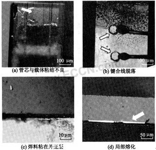 ③與燒結(jié)有關(guān)的退化。管芯與載體粘結(jié)特性不好,很容易與載體分離,歐姆接觸不好不僅增加熱耗散功率而降低激光器的效率,而且會引起局部過熱。使上述接觸電阻進一步增加,造成引線脫落等,如圖6(a)、(b)所示;另外,銦焊料過多使在加熱焊接或在后面的加速老化試驗中焊料淹浸解理面,而使激光器輸出功率減小或無輸出,如圖6(c)所示。