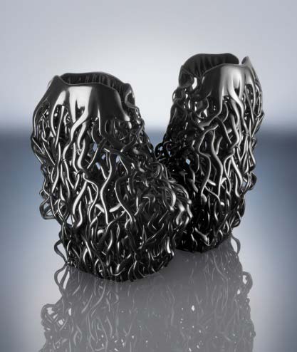 圖一:這條黑色短裙獨特復雜的蕾絲狀紋理必須采用Mammoth立體技術(shù)光固化技術(shù)(Mammoth Stereolithography machines)制作。參與設計的建筑師(沒錯,真是建筑師)Koerner說:“對計算機、3D打印以及新材料相結(jié)合的探索,給服裝帶來了新的吸引力和神秘感,也給時裝界帶來了無縫成衣的諸多可能性。”