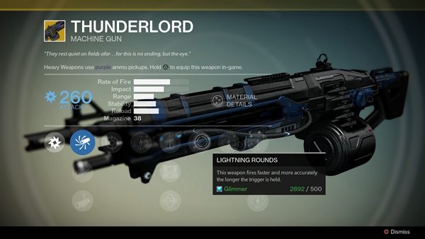 這款游戲中豐富多彩的武器系統(tǒng)是一大特色,各種武器風格各異,設計十分精美,受到眾多玩家的欣賞。其中有一款武器就吸引了眾多擁躉,那就是超級拉風的異種重機槍——雷霆之王(Thunderlord)(見下圖)。