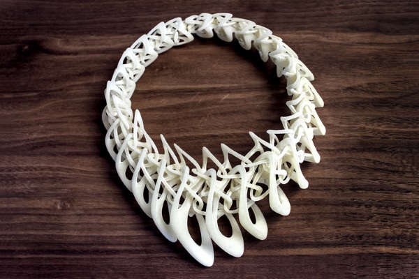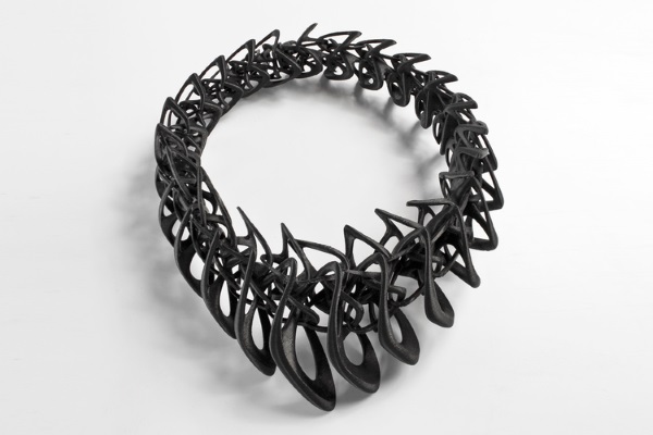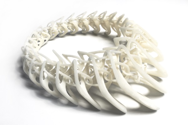 這套名為LACE的設(shè)計作品,由25件各具特色的3D打印可穿戴式設(shè)計組成,主要是項鏈和戒指。為首的LACE設(shè)計是一件Tangens項鏈,它可以是黑色、白色或半透明色。這件繁復(fù)的設(shè)計是由很多互鎖件連在一起組成的,是Stratasys公司的Fortus 400mc FDM 3D打印機用柔性尼龍材料制作的。該Tangens項鏈?zhǔn)蹆r850美元。