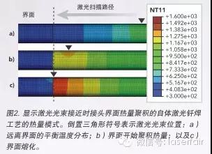 portant; word-wrap: break-word !important;">自體激光釬焊工藝旨在最大程度降低兩種材料的混合,因?yàn)槿刍w積小、淬火速率高以及局部熔化焊接接頭的一端以降低金屬間脆性。局部熱量的另一個(gè)優(yōu)勢(shì)在于能夠在混合最小的情況下以相似熔化溫度連接兩種材料。圖2顯示了面向金屬絲與金屬絲界面的激光光束掃描熱模型的溫度曲線。由于熱量聚積,在激光光束到達(dá)界面時(shí),觀察到溫度增加。
