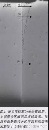 portant; word-wrap: break-word !important;">      圖3展示了使用自體激光焊接工藝形成的典型接頭。整體上講,接頭表面很干凈,沒有出現(xiàn)孔隙或裂紋的明顯跡象。沒有發(fā)現(xiàn)金屬絲大規(guī)模變形,表明加工期間基材沒有出現(xiàn)大幅熔化。圖4是沿著Y-Z平面橫截之后相同樣品的光學(xué)顯微圖。觀察到清潔界面孔隙極少或沒有孔隙,沒有裂紋,沒有界面連接不完整的跡象。接頭本身面向金屬絲中心最窄,沿著頂部和底部表面更寬。