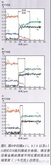 portant; word-wrap: break-word !important;">       在照射表面以不同深度在NiTi-SS界面執(zhí)行的量化能量彌散X射線譜(EDS)曲線參見圖5a–5c。兩種基材金屬成分之間的連接區(qū)域顯示了Fe、Cr、Ni和Ti之間的混合物。該混合區(qū)域的范圍表明了接頭的寬度。這種特定樣品顯示接頭寬度范圍大約在5–25 µm之間。不同的成分曲線形狀表明不同的焊接機(jī)制沿著接頭的不同區(qū)域占據(jù)主導(dǎo)。面向激光照射表面的熔化層厚度更大,表明熔化持續(xù)時(shí)間更長,能夠?qū)⒏嗖讳P鋼稀釋入熔化NiTi。觀察到面向金屬絲中心的兩種材料的熔合最小,熔化層厚度可以大幅降低。該區(qū)域的成分曲線類似于擴(kuò)散控制工藝,但是上層類似于基于熔化的連接機(jī)制。圖5還顯示接頭寬度大幅低于400µm的光束聚焦尺寸,因此確認(rèn)接頭形成的機(jī)制不是激光光束直接熔化,而是需要的熱量聚積。