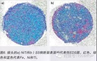 portant; word-wrap: break-word !important;">圖6a和6b顯示了使用自體激光釬焊工藝形成的接頭斷裂表面的成分圖,其中紅色、綠色和藍(lán)色分別代表Fe、Ni和Ti。兩個(gè)斷裂表面主要是綠色和藍(lán)色,表明接頭內(nèi)富含Ni和Ti的區(qū)域出現(xiàn)斷裂。成分的定量測(cè)量將斷裂表面確定在接頭之內(nèi)而不是某一種材料中。主要呈紅色的區(qū)域表示SS金屬絲連接不完整或斷裂。觀察到界面的不完整連接以恒定功率掃描速率為函數(shù)。當(dāng)激光掃描速率增加時(shí),進(jìn)入金屬絲的整體能量降低,因此具有降低熔化層厚度或消除熔化層的效應(yīng),造成覆蓋整個(gè)接觸面的熔化不充分。