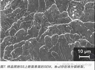 portant; word-wrap: break-word !important;">圖7顯示使用自體激光連接工藝連接樣品時(shí)通過電子顯微鏡觀察到的典型斷裂表面。表面形態(tài)表示準(zhǔn)分裂斷裂,如上所述,相信斷裂出現(xiàn)在接頭之內(nèi)而不是基材之內(nèi)。對(duì)于低掃描速率(最高1 毫米/秒)實(shí)驗(yàn),最高接頭強(qiáng)度達(dá)到大約275 MPa。雖然該強(qiáng)度大約等于不銹鋼的屈服應(yīng)力,但是,未觀察到斷裂之前不銹鋼金屬絲之內(nèi)的可感知塑性變形。最近開展的更高速率和功率(8瓦時(shí)高達(dá)2毫米/秒)實(shí)驗(yàn)已經(jīng)顯示斷裂應(yīng)力超過470 MPa。人們相信提高掃描速率能夠使熱量更加局部化和聚積,以在較短持續(xù)時(shí)間形成較小的熔化池,因此導(dǎo)致基材之間的混合降低以及金屬間形成和演化過程減少。