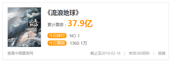 春節(jié)期間,中國科幻電影《流浪地球》登陸各大影院,在競爭激烈的春節(jié)檔期收獲票房冠軍。截止至2019年2月18日10:00,票房已高達39.7億。(來源中國票房網(wǎng))