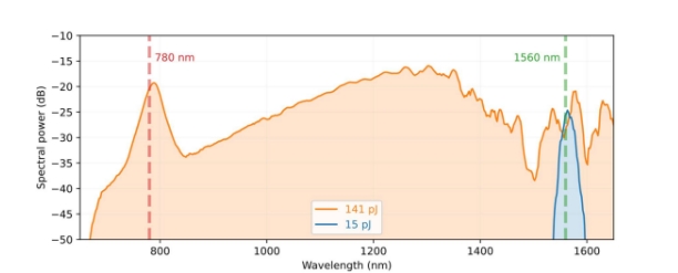 Octave Photonics 超連續(xù)譜模塊的輸出使用 1560 nm 輸入(PM780 輸出光纖)生成 780 nm 光。 在低脈沖能量 (15 pJ) 下,光譜相對(duì)較窄。 對(duì)于高于 140 pJ 的脈沖能量,會(huì)產(chǎn)生峰值為 780 nm 的寬帶光,可用于激光頻率梳的 fceo 檢測(cè)。 (請(qǐng)注意,模塊的輸出具有 PM780 nm 光纖,波長(zhǎng)超過(guò) ~1300 nm 的光會(huì)部分衰減??筛鶕?jù)要求提供替代輸出光纖。)
