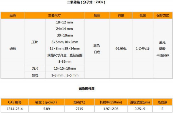 二氧化鋯,一種高折射率材料,能夠應(yīng)用于近紫外激光,分光鏡,增透鏡,電介質(zhì)鏡,及多層激光膜。