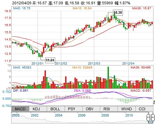 今 開: 16.67 成交量: 55968手 振 幅: 3.07% 最 高: 17.09 成交額: 9467.22萬 換手率: 1.37% 最 低: 16.58 總市值: 75.34億 市凈率: 2.86 昨 收: 16.60 流通...