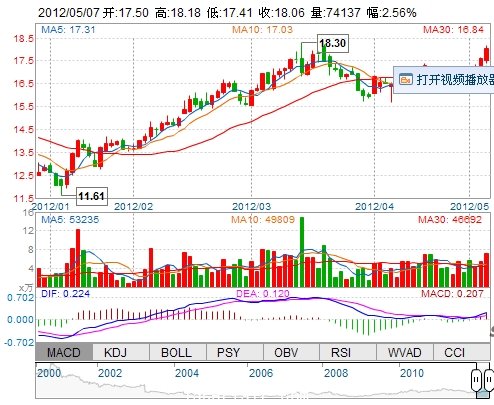 今 開(kāi): 17.50 成交量: 74137手 振 幅: 4.37% 最 高: 18.18 成交額: 13236.32萬(wàn) 換手率: 1.82% 最 低: 17.41 總市值: 80.47億 市凈率: 3.05 昨 收: 17.61 流通...