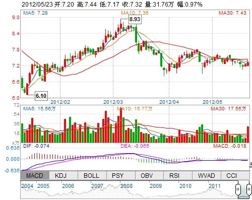 今 開: 7.20 成交量: 317630手 振 幅: 3.72% 最 高: 7.44 成交額: 23312.94萬 換手率: 3.36% 最 低: 7.17 總市值: 76.45億 市凈率: 2.57 昨 收: 7.25 流通市...