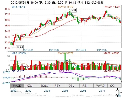 今 開: 16.00 成交量: 41311手 振 幅: 1.87% 最 高: 16.30 成交額: 6677.65萬 換手率: 1.01% 最 低: 16.00 總市值: 72.09億 市凈率: 2.73 昨 收: 16.07 流通...
