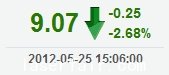 今 開: 9.25 成交量: 11363手 振 幅: 3.43% 最 高: 9.39 成交額: 1046.83萬 換手率: 0.59% 最 低: 9.07 總市值: 18.07億 市凈率: 3.75 昨 收: 9.32 流通市值...