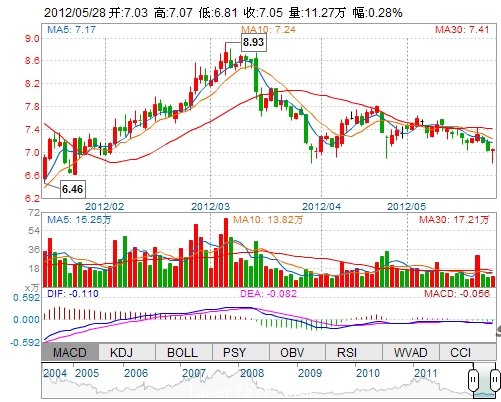 今 開: 7.03 成交量: 112692手 振 幅: 3.70% 最 高: 7.07 成交額: 7809.97萬(wàn) 換手率: 1.19% 最 低: 6.81 總市值: 73.63億 市凈率: 2.47 昨 收: 7.03 流通市值...