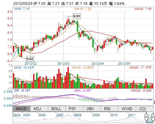 今 開: 7.05 成交量: 151424手 振 幅: 2.84% 最 高: 7.21 成交額: 10806.52萬(wàn) 換手率: 1.60% 最 低: 7.01 總市值: 74.99億 市凈率: 2.52 昨 收: 7.05 流通市...