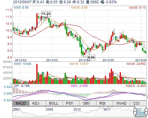 今 開: 8.43 成交量: 6892手 振 幅: 3.22% 最 高: 8.55 成交額: 580.37萬 換手率: 0.35% 最 低: 8.28 總市值: 16.58億 市凈率: 3.44 昨 收: 8.39 流通市值: ...