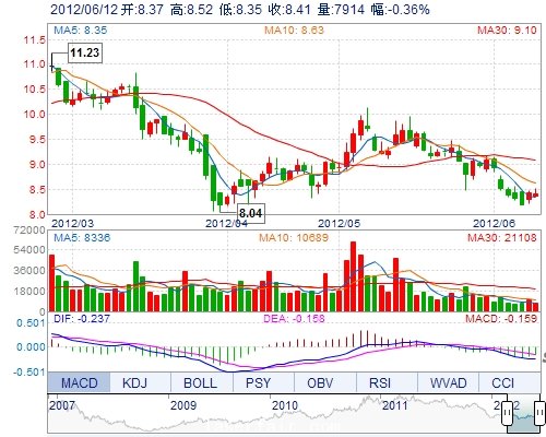 今 開: 8.37 成交量: 7913手 振 幅: 2.01% 最 高: 8.52 成交額: 668.49萬 換手率: 0.41% 最 低: 8.35 總市值: 16.76億 市凈率: 3.48 昨 收: 8.44 流通市值: ...
