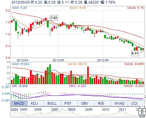 今 開: 6.20 成交量: 48220手 振 幅: 2.76% 最 高: 6.28 成交額: 2990.77萬 換手率: 0.51% 最 低: 6.11 總市值: 65.59億 市凈率: 2.20 昨 收: 6.17 流通市值...