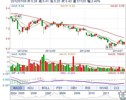 今 開: 6.28 成交量: 51120手 振 幅: 3.36% 最 高: 6.41 成交額: 3226.40萬 換手率: 0.54% 最 低: 6.20 總市值: 66.84億 市凈率: 2.25 昨 收: 6.25 流通市值...