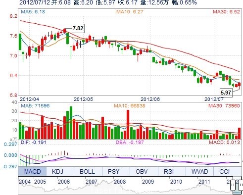 今 開: 6.08 成交量: 125632手 振 幅: 3.75% 最 高: 6.20 成交額: 7631.88萬 換手率: 1.33% 最 低: 5.97 總市值: 64.44億 市凈率: 2.16 昨 收: 6.13 流通市值...