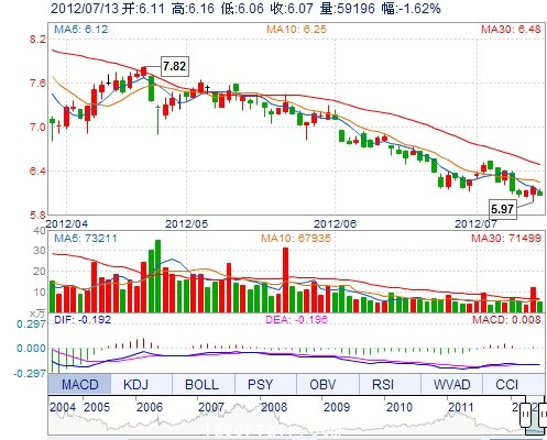 今 開: 6.11 成交量: 59195手 振 幅: 1.62% 最 高: 6.16 成交額: 3614.57萬 換手率: 0.63% 最 低: 6.06 總市值: 63.39億 市凈率: 2.13 昨 收: 6.17 流通市值...