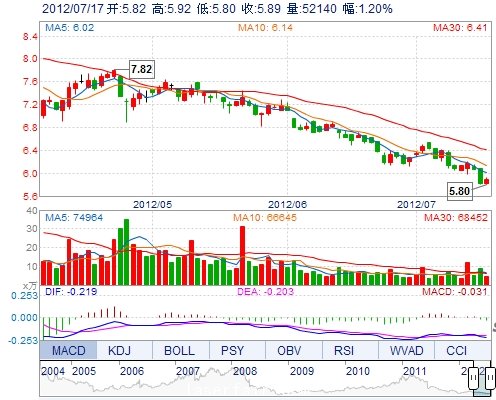 今 開: 5.82 成交量: 52140手 振 幅: 2.06% 最 高: 5.92 成交額: 3059.60萬 換手率: 0.55% 最 低: 5.80 總市值: 61.51億 市凈率: 2.07 昨 收: 5.82 流通市值...