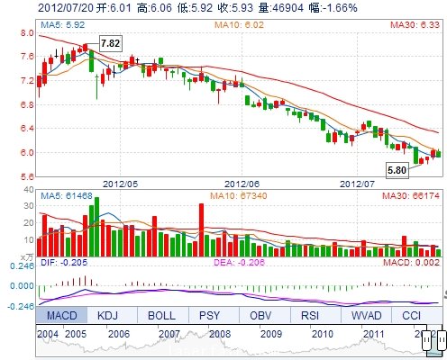 今 開: 6.01 成交量: 46904手 振 幅: 2.32% 最 高: 6.06 成交額: 2803.83萬 換手率: 0.50% 最 低: 5.92 總市值: 61.93億 市凈率: 2.08 昨 收: 6.03 流通市值...