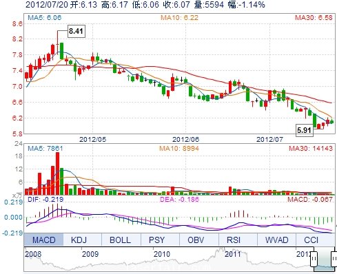 今 開: 6.13 成交量: 5594手 振 幅: 1.79% 最 高: 6.17 成交額: 341.76萬 換手率: 0.20% 最 低: 6.06 總市值: 17.30億 市凈率: 2.77 昨 收: 6.14 流通市值: ...